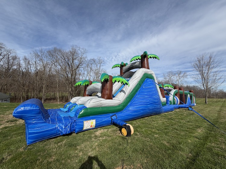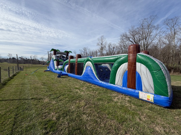 At an impressive 73 feet long, the Treasure Island course keeps kids, teens, and adults moving from start to finish. The bold pirate graphics and tropical colors make it a standout attraction for school field days, church events, corporate outings, festivals, and backyard parties.